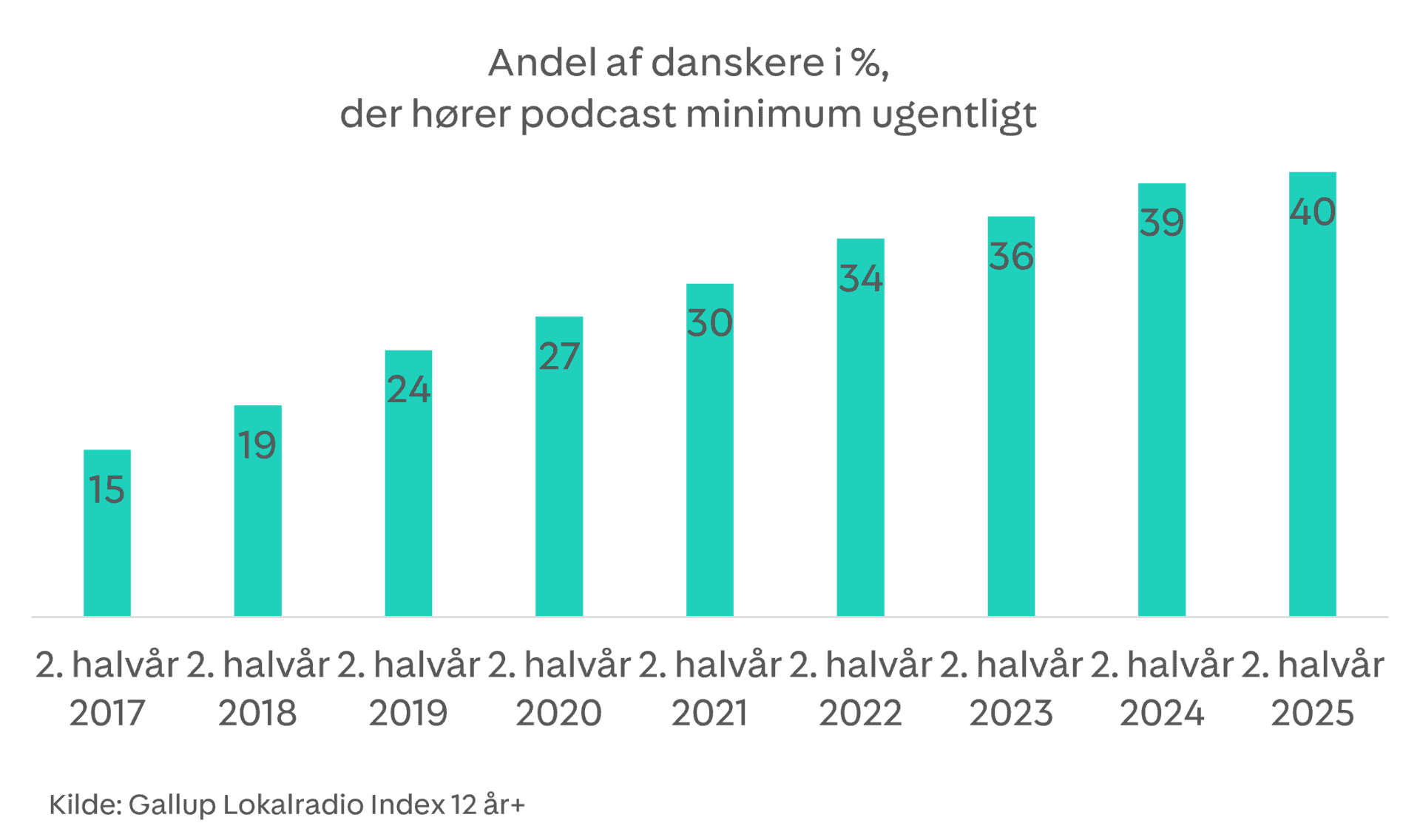 Podcastmediet har på få år undergået en rivende udvikling, både hvad angår udbredelse og lytning. 71% af danskerne har hørt en podcast og hele 40% af danskerne lytter til podcast ugentligt. Podcast er således gået fra et være et nichemedie til et mere mainstream-medie.